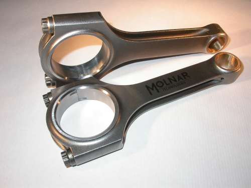 Our H-Beam Connecting Rods are made from 4340 billet material, heat treated to increase tensile strength and shot peened to increase fatigue life. All rods have a wear resistant bronze bushing for long wrist pin life and feature ARP2000 material bolts that are custom made for us by ARP. All MOLNAR TECHNOLOGIES connecting rods are finished here in the USA at our factory near Grand Rapids, Michigan.